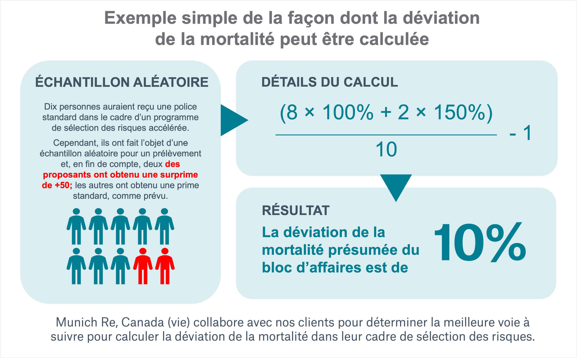 Aux États-Unis, une approche courante pour évaluer la déviation de la mortalité consiste à examiner les résultats de chaque échantillon aléatoire et à comparer ce que la décision de sélection des risques accélérée aurait été par rapport à la décision définitive une fois que les preuves de sélection des risques supplémentaires ont été prises en compte. Les différences résultant des échantillons aléatoires sont ensuite pondérées en fonction de la valeur actualisée des réclamations prévues. À l’heure actuelle, aucune méthode uniforme n’est utilisée au Canada pour calculer la déviation de la mortalité. La capacité d’un assureur à calculer la déviation de la mortalité peut être influencée par la façon et le moment où, dans le cadre du processus de sélection des risques, les échantillons aléatoires sont déterminés, par la décision théorique d’un échantillon aléatoire concernant une sélection des risques accélérée malgré la vérification, et par le nombre d’échantillons aléatoires effectués, en particulier selon les catégories les plus intéressantes en ce qui a trait à l’âge et au montant d’assurance.